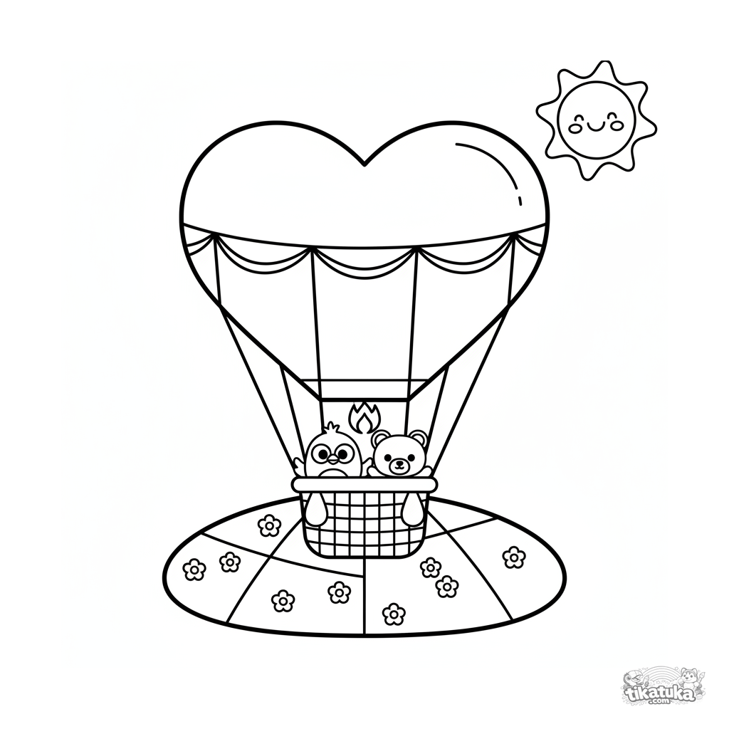 Einfaches Ausmalbild für Kleinkinder von 2 bis 3: Ein großer herzförmiger Heißluftballon mit Korb schwebt über einer hellen Blumenwiese. Große, klare Formen.