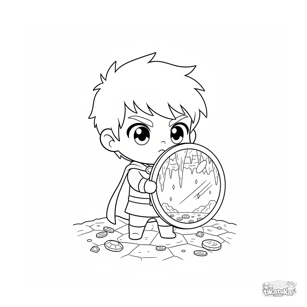 Ausmalbild: ein süßer Chibi-Held mit einem großen Schild in der Gorgonenhöhle. Für Kinder von 4-6 Jahren. Einfache Formen, lustiger Gesichtsausdruck, Schatz auf dem Boden.