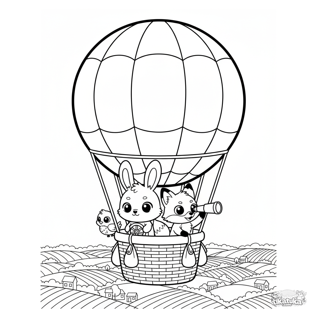 Helles Ausmalbild eines Heißluftballons im niedlichen Chibi-Stil mit Tierbesatzung im Korb. Für Kinder von 4-6 Jahren. Fröhliche Charaktere, klare Formen.