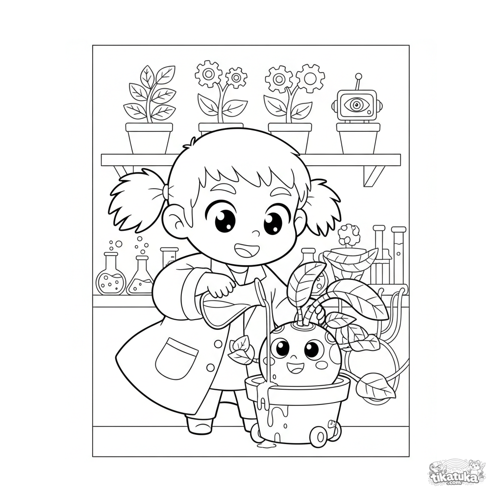 Ausmalbild für Kinder 4-6 im Chibi-Stil: Ein Erfinderjunge füttert im Labor einen Pflanzen-Roboter mit leuchtender Flüssigkeit. Niedliche und einfache Formen.