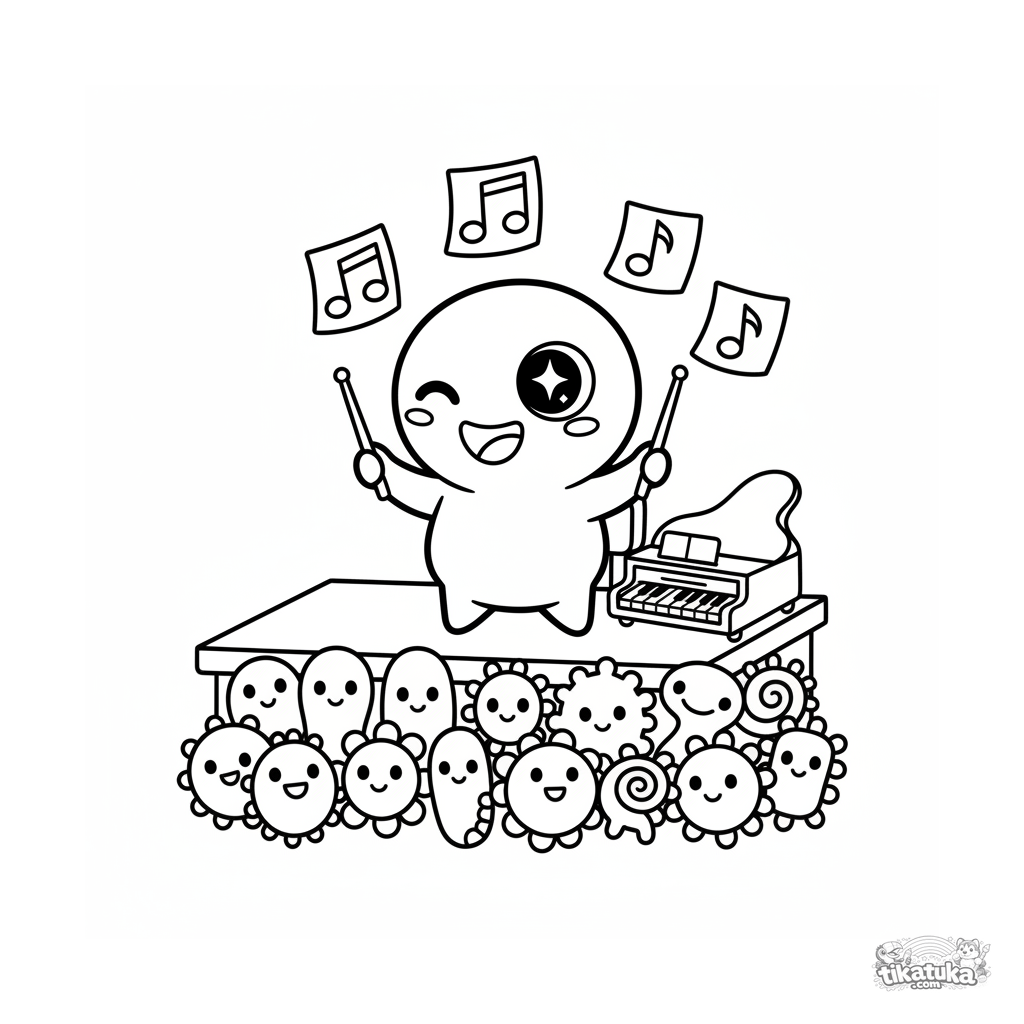 Ausmalbild eines Mikroben-Dirigenten für Kinder 4-6. Lustige Figur leitet einen Mikroben-Chor im Klassenzimmer, mit schwebenden Noten und einem Spielzeugklavier.