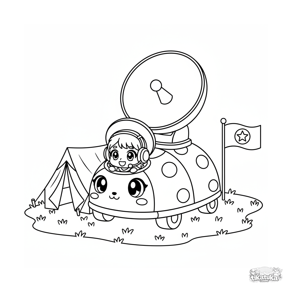 Ausmalbild für Kinder 7-9 im Chibi-Stil: Eine süße mobile Radareinheit mit rotierender Schüssel beim Kommandozelt. Ein Operator mit Kopfhörern. Lustige Proportionen.