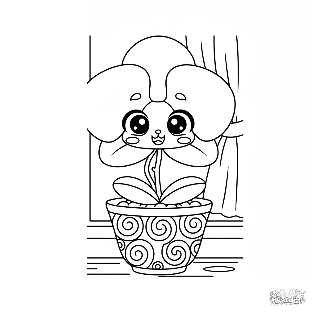 Ausmalbild für Kinder 4-6: Eine süße Chibi-Orchidee in einem schicken Topf auf der Fensterbank. Die Blume hat einen lustigen Gesichtsausdruck.