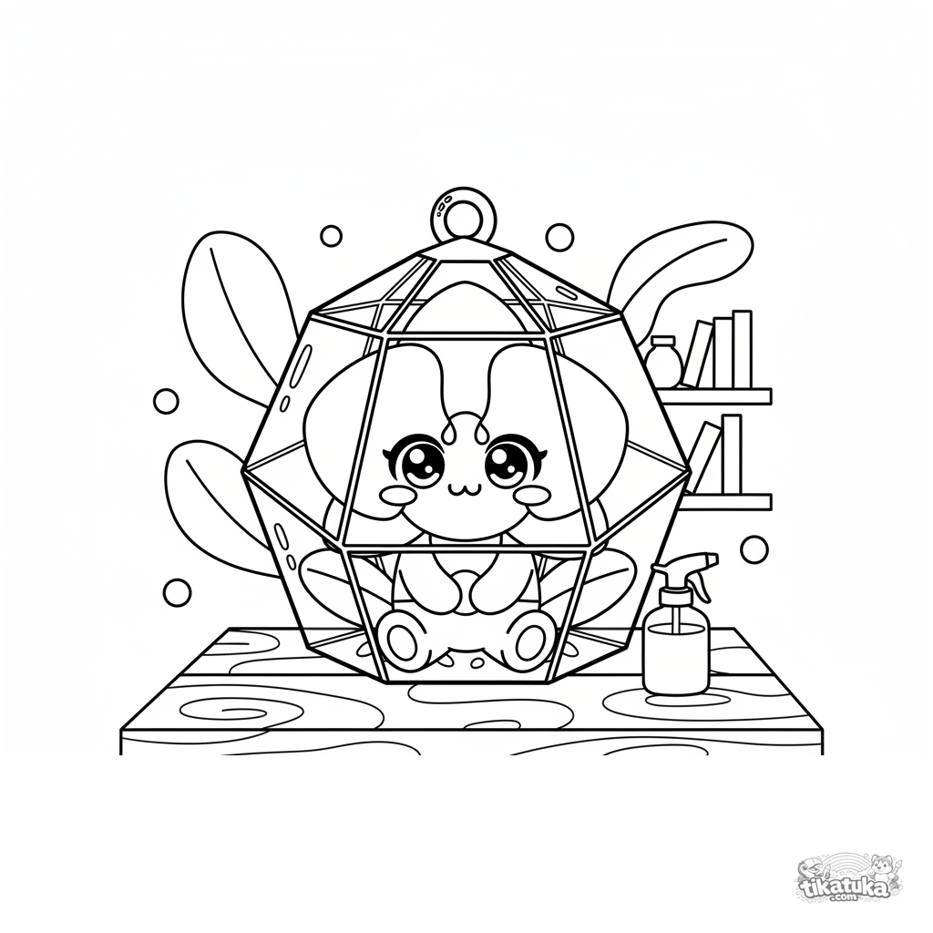 Chibi-Orchidee im Glasterrarium Ausmalbild für Kinder von 4-6 Jahren. Niedliche Blume mit Gesicht in ihrem kleinen Zuhause.