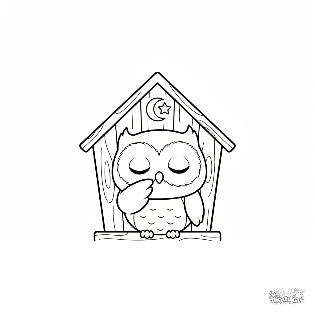 Einfaches Ausmalbild für Kleinkinder 2-3: Eine niedliche Baby-Eule schläft fest in einem gemütlichen Holz-Vogelhaus. Große, einfache Formen mit sehr breiten Rändern.