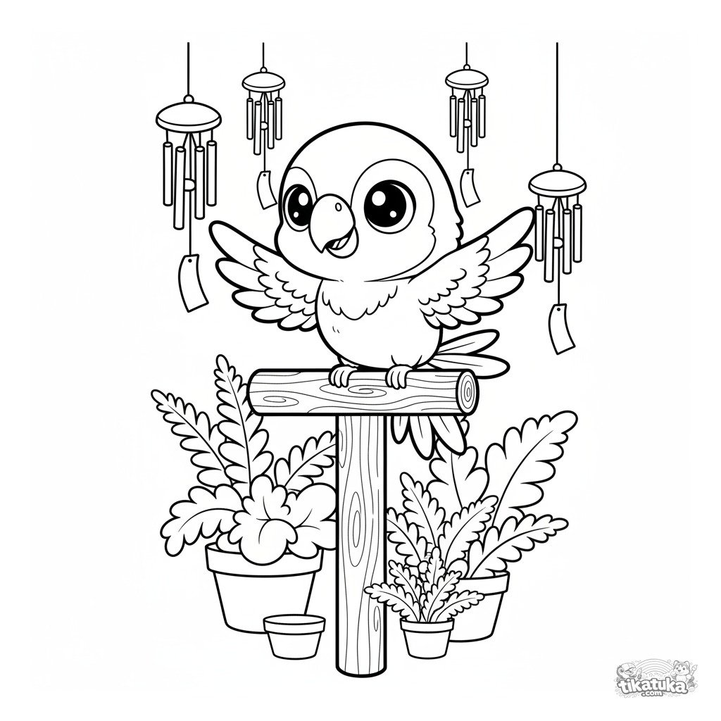Ausmalbild für Kinder 4-6: Ein süßer Chibi-Papagei lernt, von einem Gartenast zu fliegen. Großer Kopf, winzige Flügel, entschlossener Ausdruck.