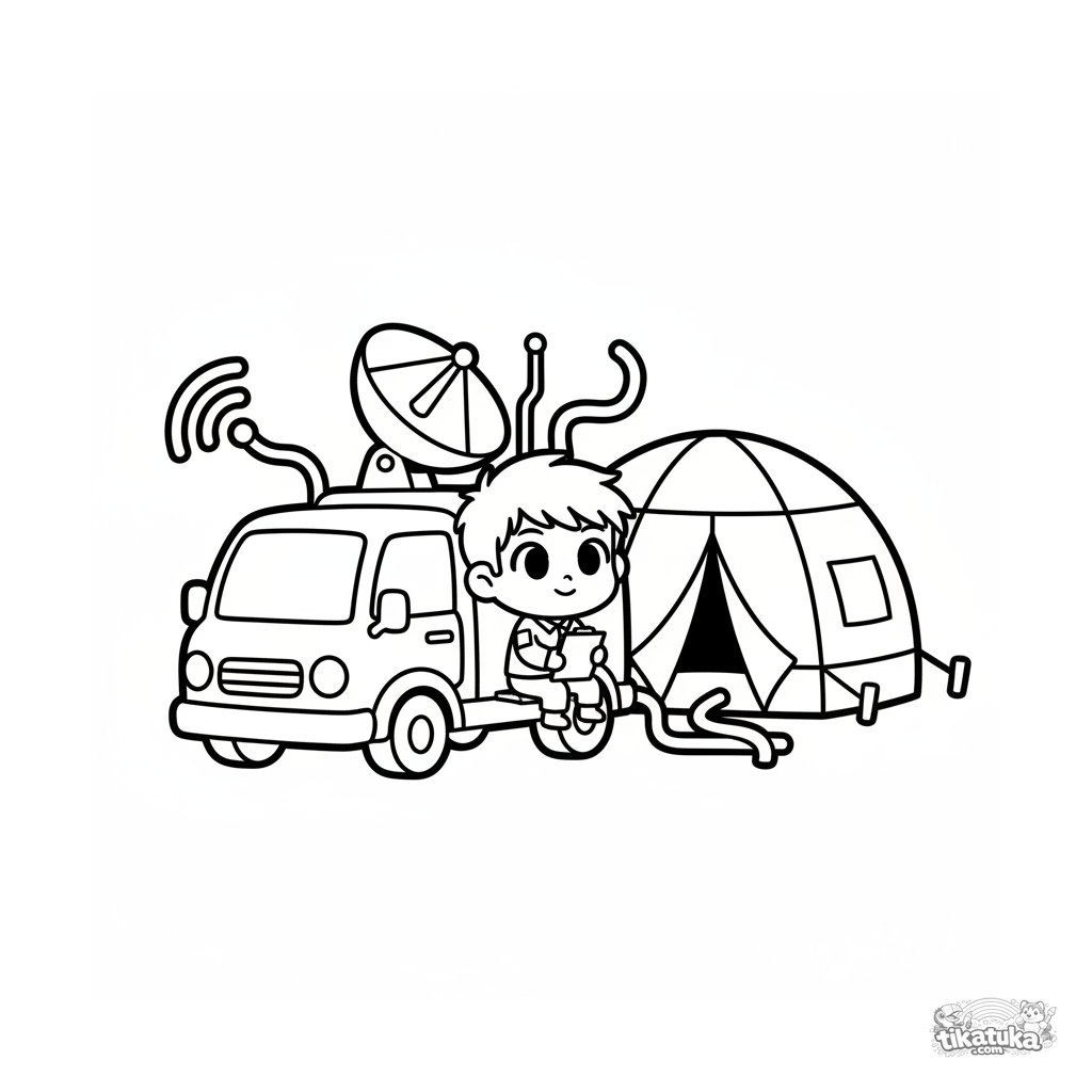 Einfaches Ausmalbild für Kleinkinder 2-3: Ein niedlicher Funkwagen mit Parabolantenne steht am Feldhauptquartier-Zelt. Ein Soldat mit Klemmbrett.