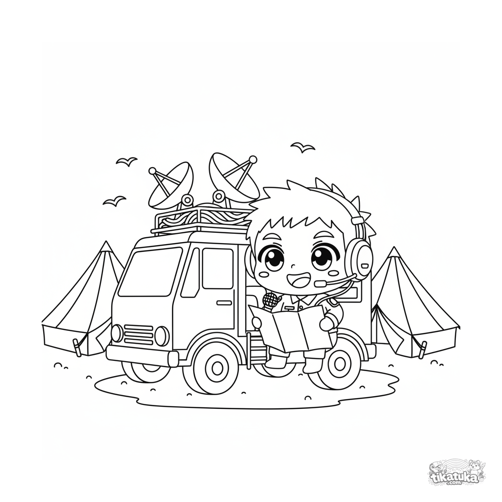Ausmalbild für Kinder 7-9: Ein Soldat im niedlichen Chibi-Stil arbeitet in einem Funkwagen in der Nähe von Feldhauptquartierzelten.