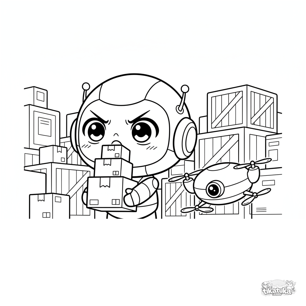 Ausmalbild für Kinder 4-6: Ein niedlicher Chibi-Roboter trägt einen Stapel Kisten in einem Lager. Lustige Pose, großer Kopf.