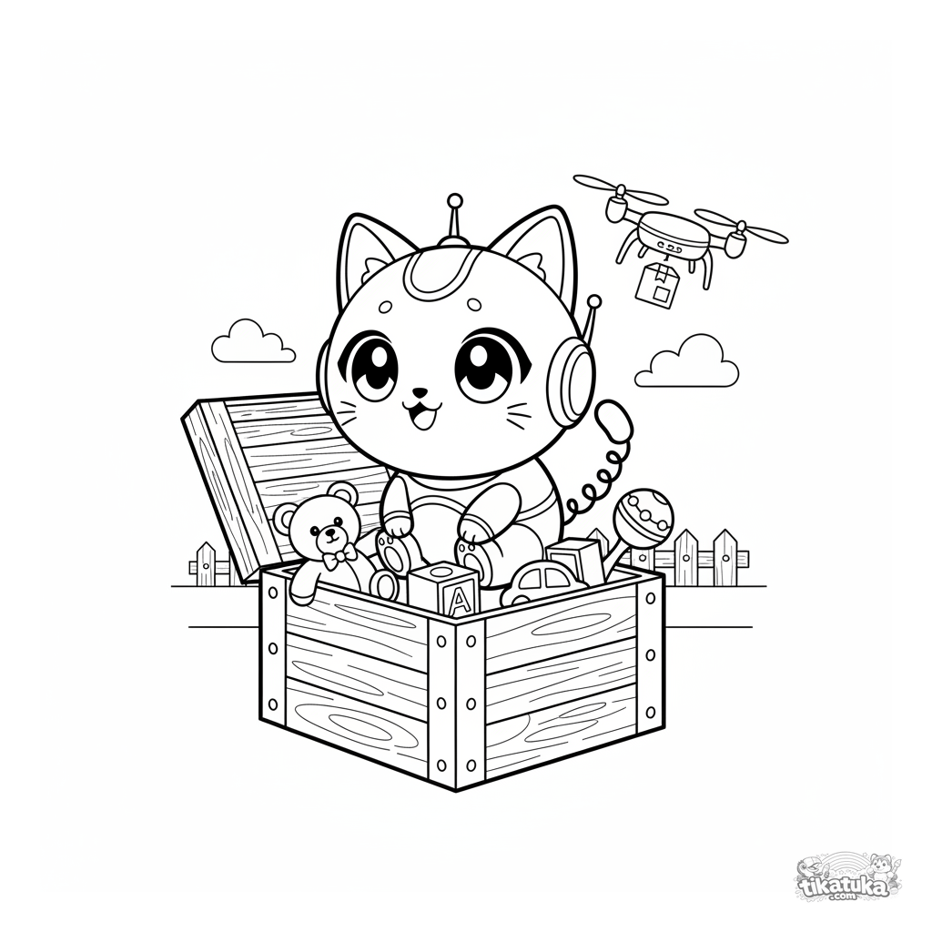 Ausmalbild für Kinder 7-9: Eine süße Chibi-Roboter-Katze schaut überrascht in eine frisch geöffnete Spielzeugkiste im Lager. Helle, dynamische Szene.