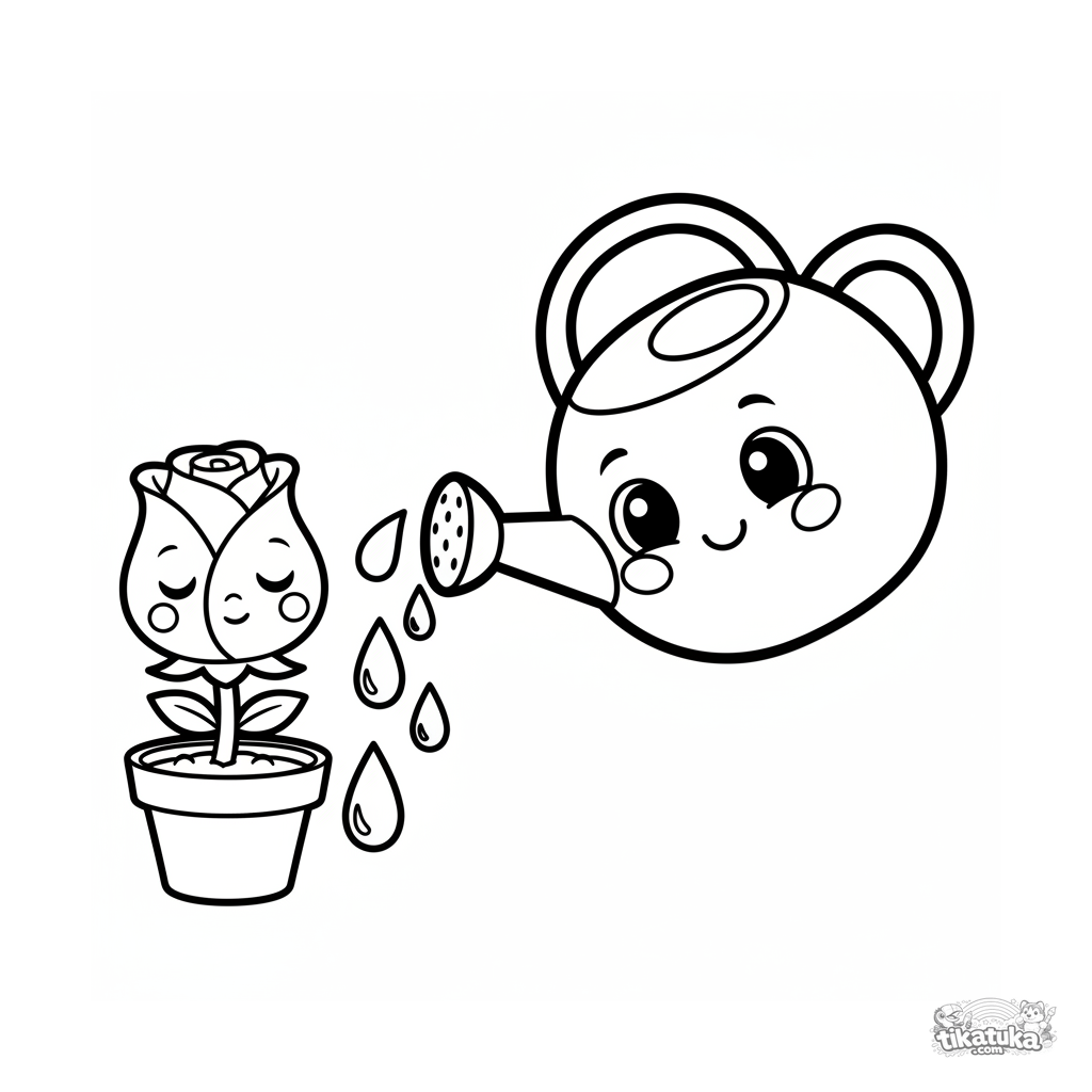 Einfaches Ausmalbild für Kleinkinder 2-3: Eine niedliche Chibi-Rosenknospe im Topf und eine große lächelnde Gießkanne, die sie gerade gegossen hat.