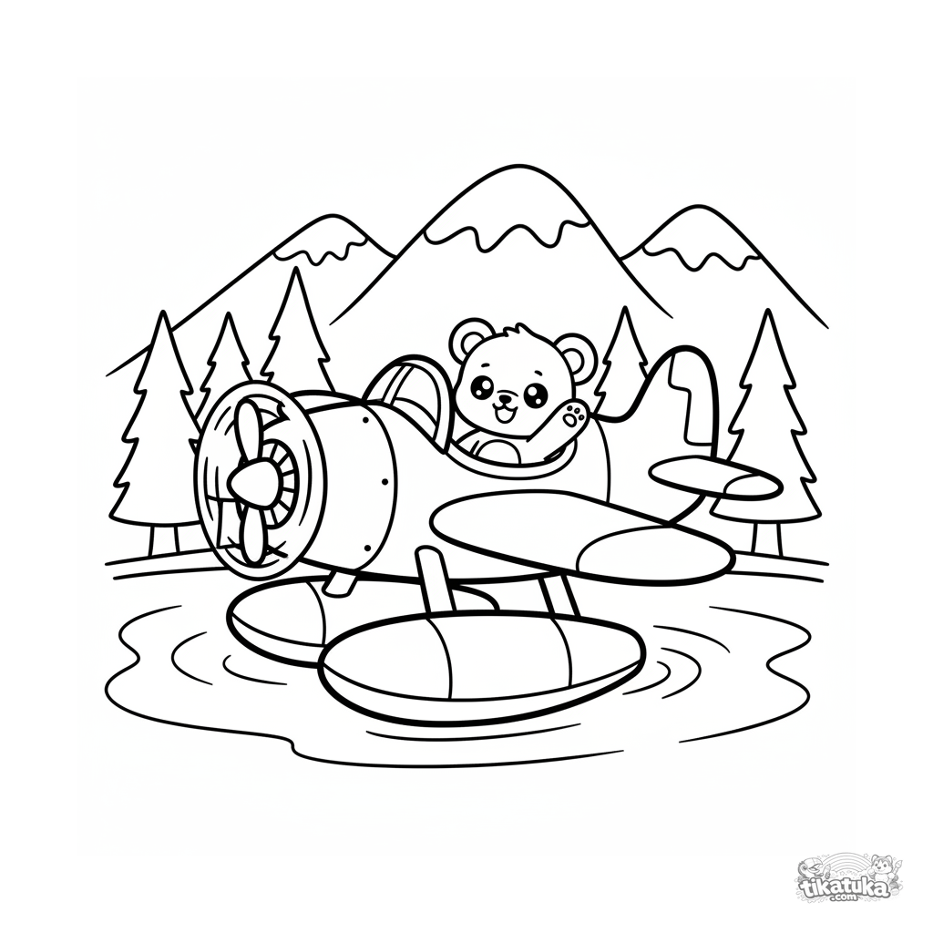 Einfaches Ausmalbild für Kleinkinder von 2-3 Jahren: ein niedliches Chibi-Wasserflugzeug startet von einem Bergsee. Große Formen, dicke Umrisse, wenige Details.