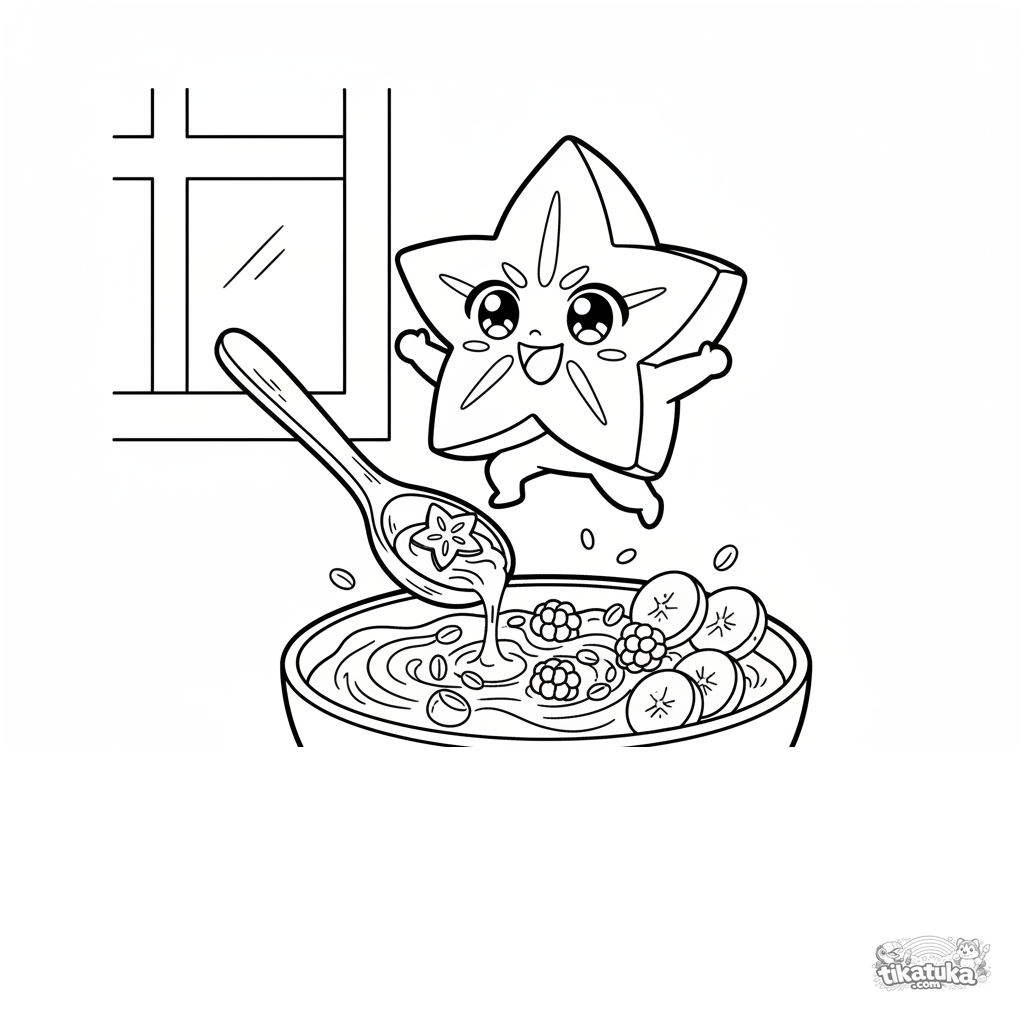 Ausmalbild für Kinder 7-9: Ein fröhlicher Chibi-Sternfrucht-Schnitt springt in eine Smoothie-Schüssel. Dynamische Frühstücksszene mit klaren Umrissen.