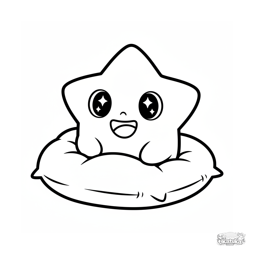 Kinder-Ausmalbild für 2-3 Jahre: ein süßer Stern im Chibi-Stil auf einem Kissen. Vereinfachte Formen, riesiges Lächeln, breite saubere Ränder.