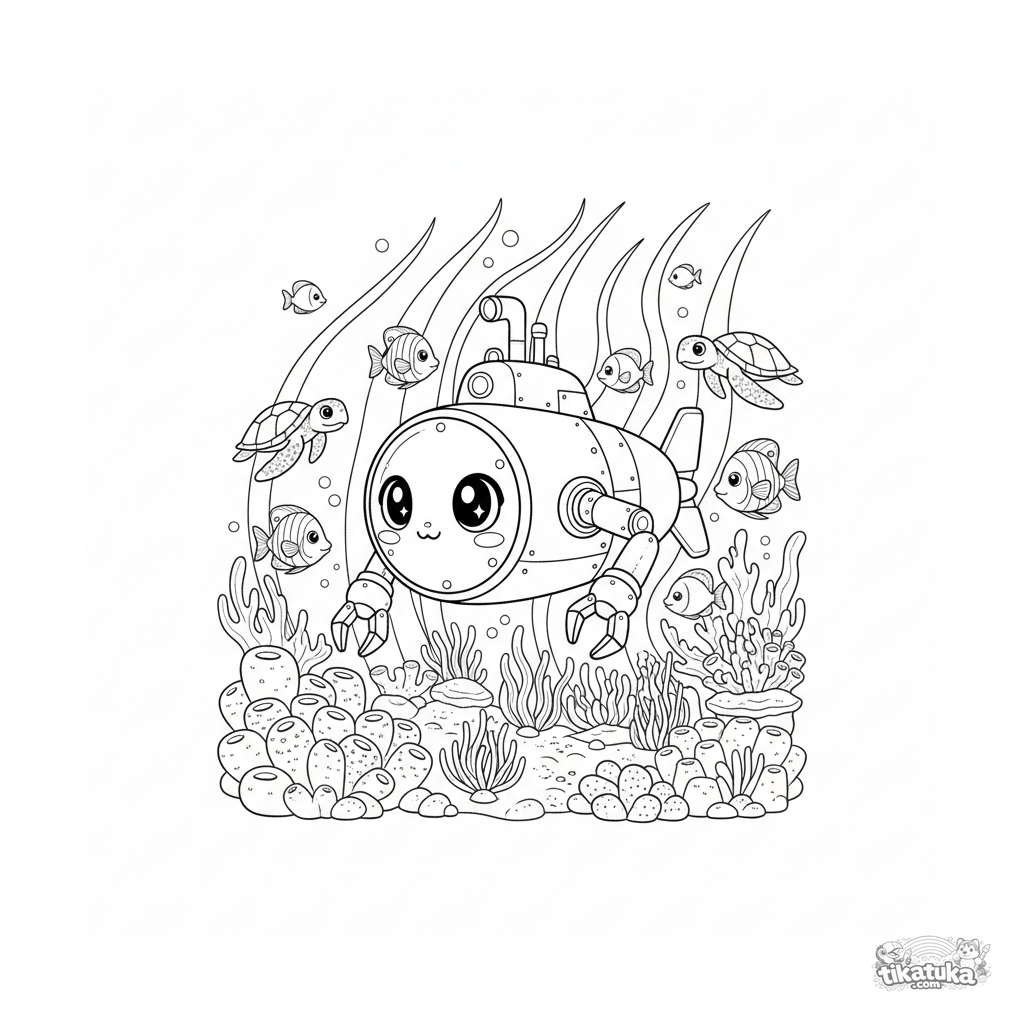 Ausmalbild für Kinder 4-6: Ein süßes Chibi-U-Boot erforscht ein lebendiges Korallenriff in einer tropischen Bucht. Ausgewogenes Detail, klare Formen.
