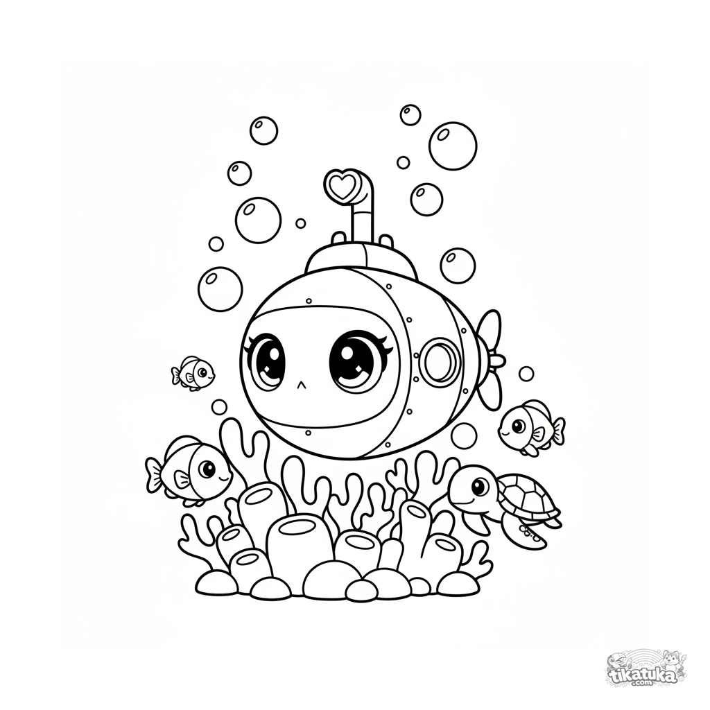 Ausmalbild für Kinder 4-6: Ein süßes Chibi-U-Boot mit großen Augen erkundet ein farbenfrohes Korallenriff. Fische und eine Meeresschildkröte schwimmen herum, mit vielen Blasen.