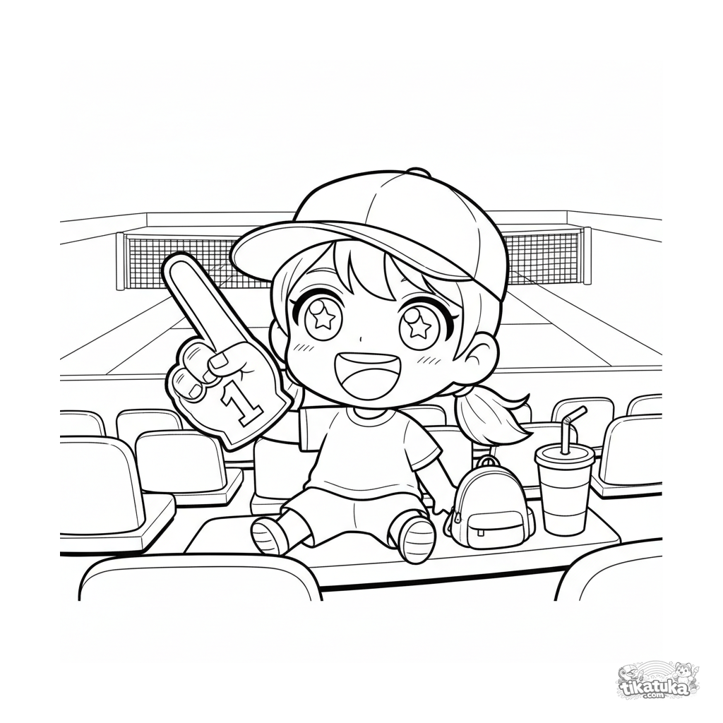 Ausmalbild für Kinder 4-6 Jahre im Chibi-Stil: ein süßer Fan auf der Tennisplatz-Tribüne winkt mit einem großen Schaumstofffinger.