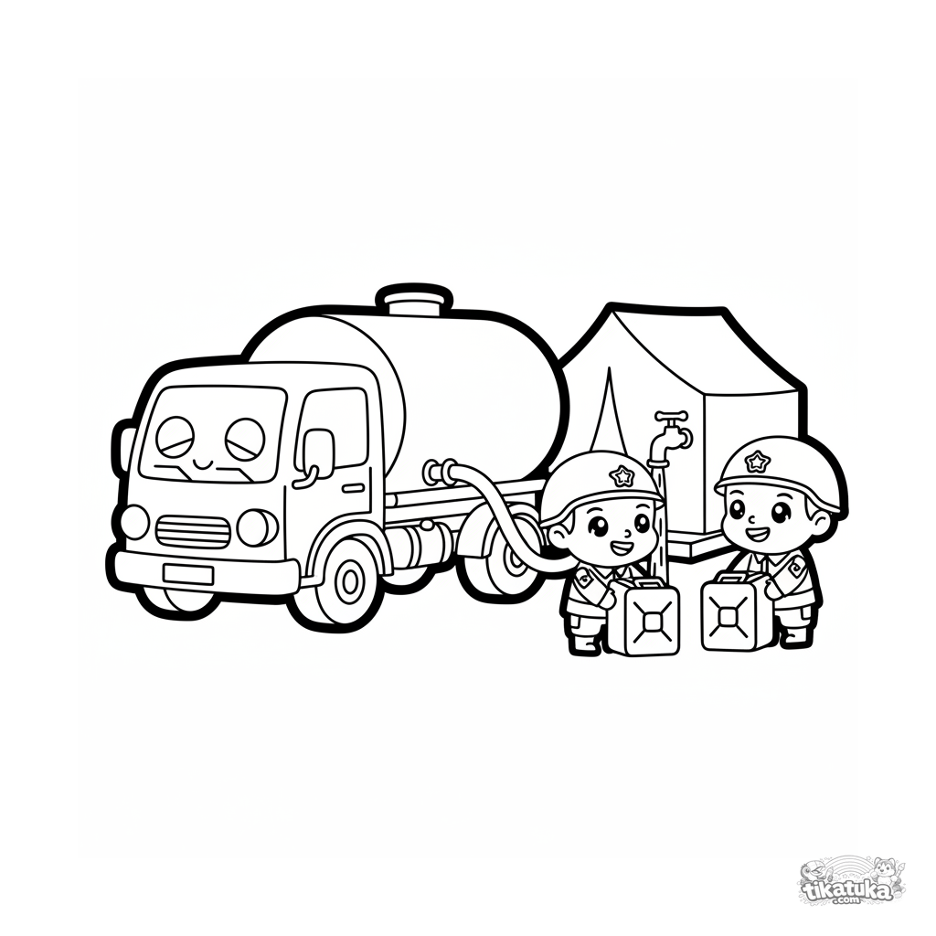 Kleinkind-Ausmalbild 2-3 Jahre: Ein süßer Chibi-Wasserwagen verteilt Wasser an den Zelten. Sehr einfache, große Formen zum ersten Ausmalen.