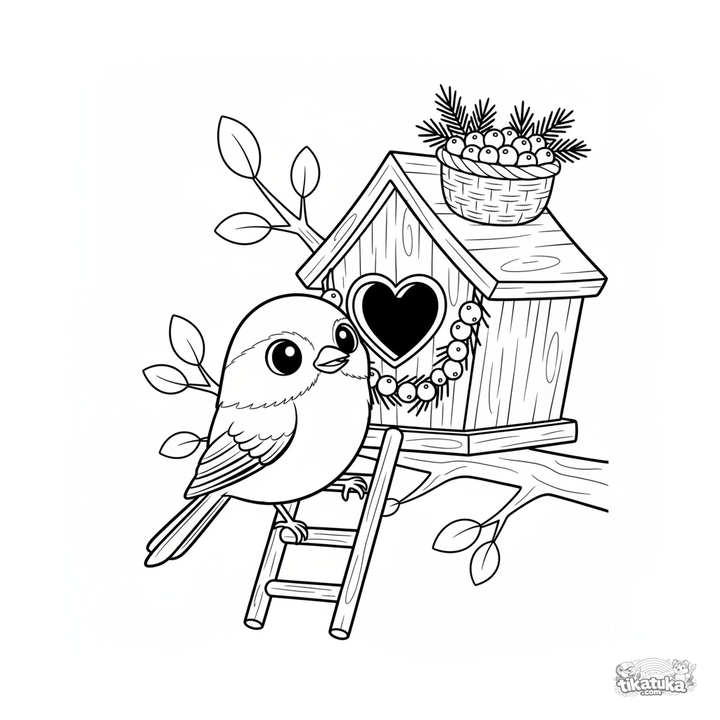 Niedliches Kawaii-Ausmalbild für Kinder 4-6: eine Meise dekoriert eine Vogelhaustür mit einer Beerengirlande.