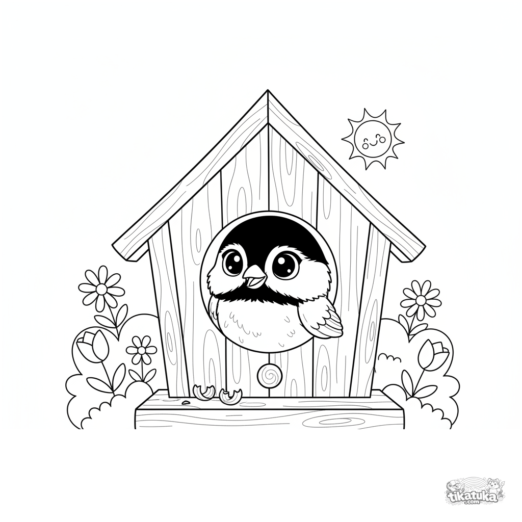Ausmalbild für Kinder 4-6: Eine Meise guckt aus dem runden Loch eines Holz-Vogelhauses im Garten. Niedliche und einfache Szene zum Ausmalen.