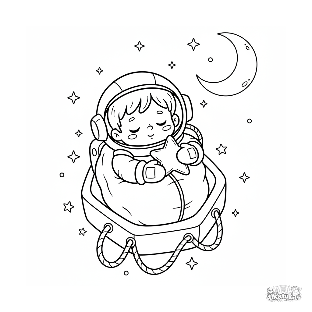 Ausmalbild für 4-6 Jahre: Ein Kind im Raumanzug schläft in einem gemütlichen Schlafsack, der an einer Raumkapsel befestigt ist. Eine niedliche und friedliche Szene zwischen den Sternen.