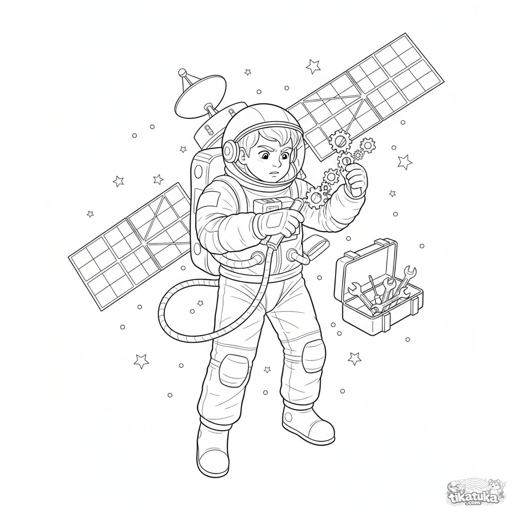 Detailliertes Ausmalbild für 10-12 Jahre: Ein Kind-Astronaut repariert einen Satelliten im Weltraum, Werkzeuge und Sterne schweben umher.