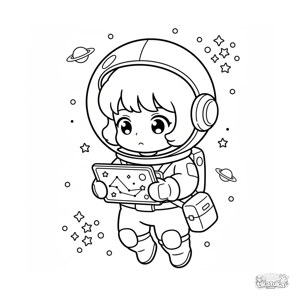 Ausmalbild für Kinder 7-9: Ein junger Forscher im Weltraum kartiert die Sterne.