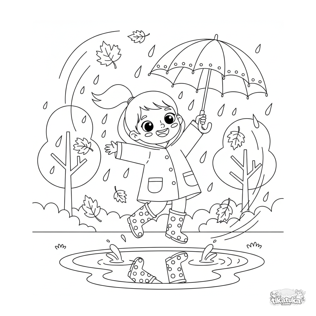 Ausmalbild für Kinder 4-6 Jahre: ein fröhliches Kind in Gummistiefeln und mit Regenschirm fängt bunte Herbstblätter im Regen. Helle, dynamische Szene mit klaren Umrissen.