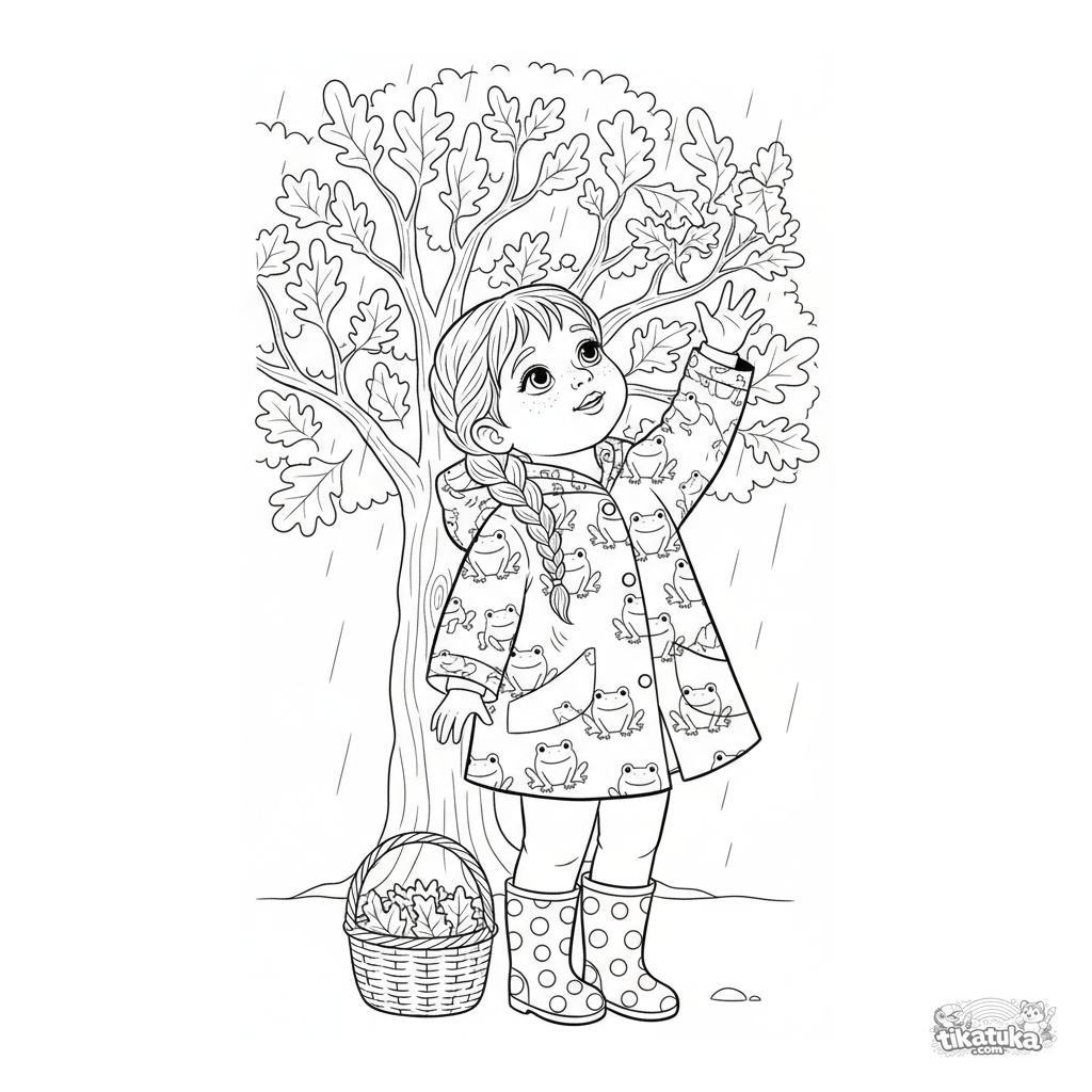 Ausmalbild für Kinder 7-9: Ein Kind in Regenjacke und Stiefeln fängt fallende nasse Blätter unter einer Herbst-Eiche.