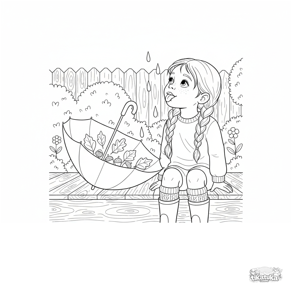 Ausmalbild für Tweens 7-9 Jahre: ein Mädchen in Socken und Stiefeln sitzt auf einer Veranda und fängt Herbstregentropfen mit der Zunge. Warme, detaillierte Szene mit Stimmung.