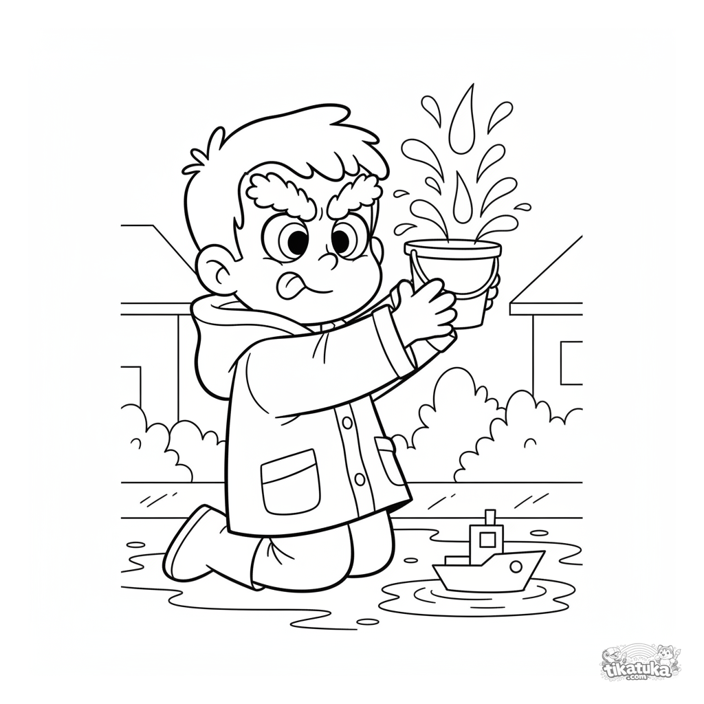Ausmalbild für Kinder 4-6: Ein verspieltes Kind im gelben Regenmantel kniet auf einer nassen Einfahrt und versucht, Regentropfen in einem kleinen Eimer aufzufangen.