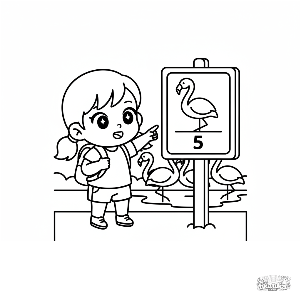 Ausmalbild für Kleinkinder 2-3: Ein Kind zählt Flamingos auf einem Gehege-Schild im Zoo. Einfache Formen, große Details, Zahlen lernen.