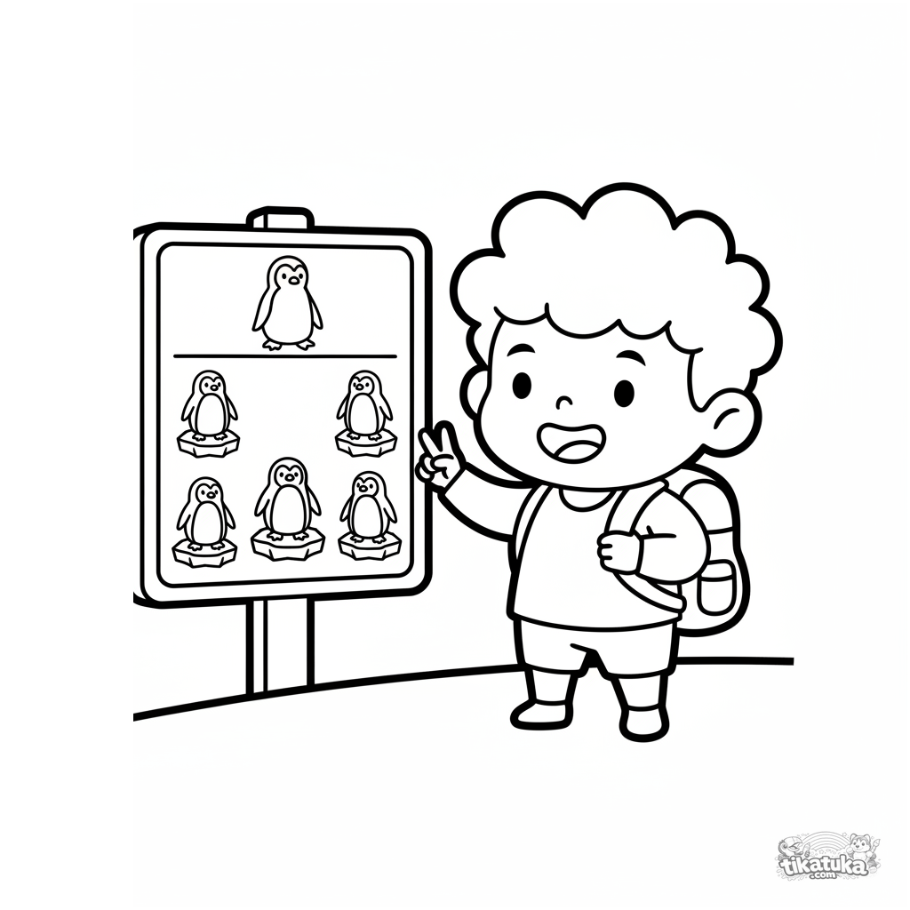 Ausmalbild für Kleinkinder 2-3: Ein Kind zählt Pinguine an einem Gehegeschild im Zoo. Einfache Formen, große Details, Zählen lernen.