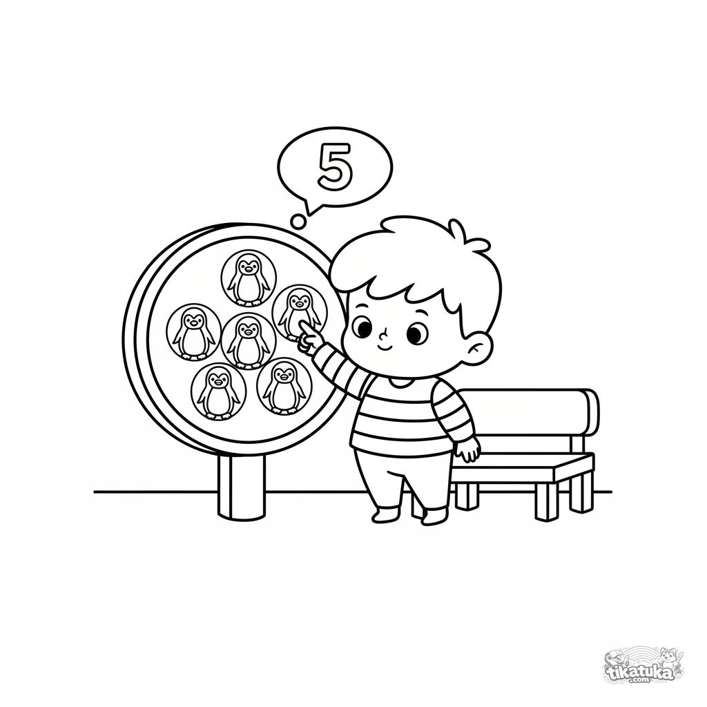 Ausmalbild für Kleinkinder von 2-3 Jahren. Ein Kind zählt Pinguine auf einer großen Zoo-Karte. Sehr einfache Formen, große Ausmalbereiche, Zählen lernen.