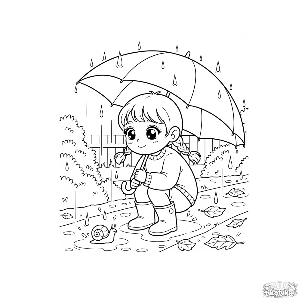 Ausmalbild für Kinder 4-6: ein freundliches Kind in Stiefeln hockt auf einem Weg und hält einen Schirm über eine Schnecke.