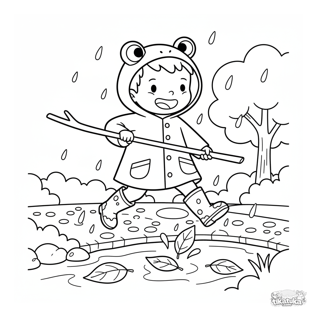 Ausmalbild für Kleinkinder 2-3 Jahre: ein fröhliches Kind in Stiefeln und einem Froschregenmantel springt über einen Bach nach dem Regen. Sehr einfache, große Formen.