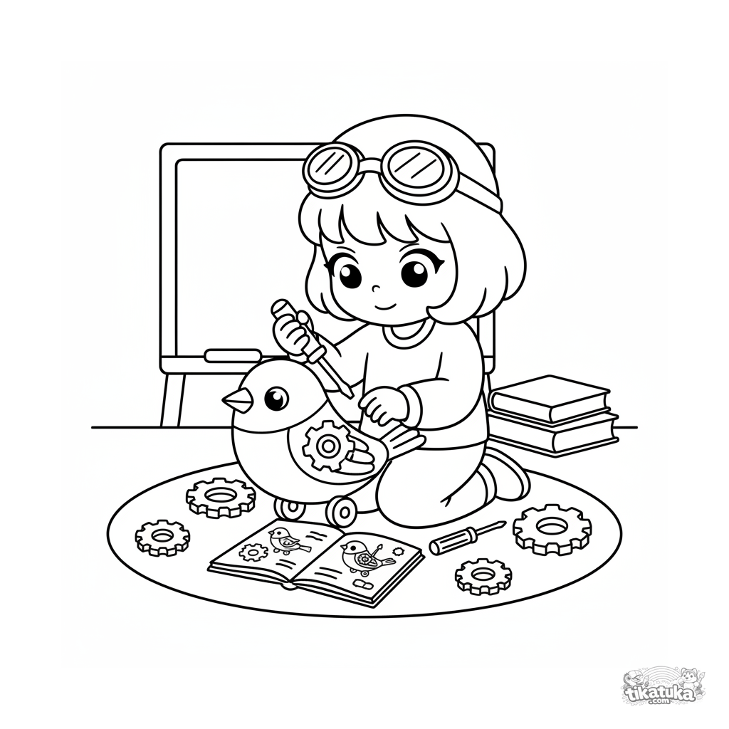 Ausmalbild für Kleinkinder 2-3: ein Kinder-Erfinder mit Schutzbrille repariert ein Aufziehspielzeug auf dem Klassenzimmerboden. Einfache, große Formen zum leichten Ausmalen.