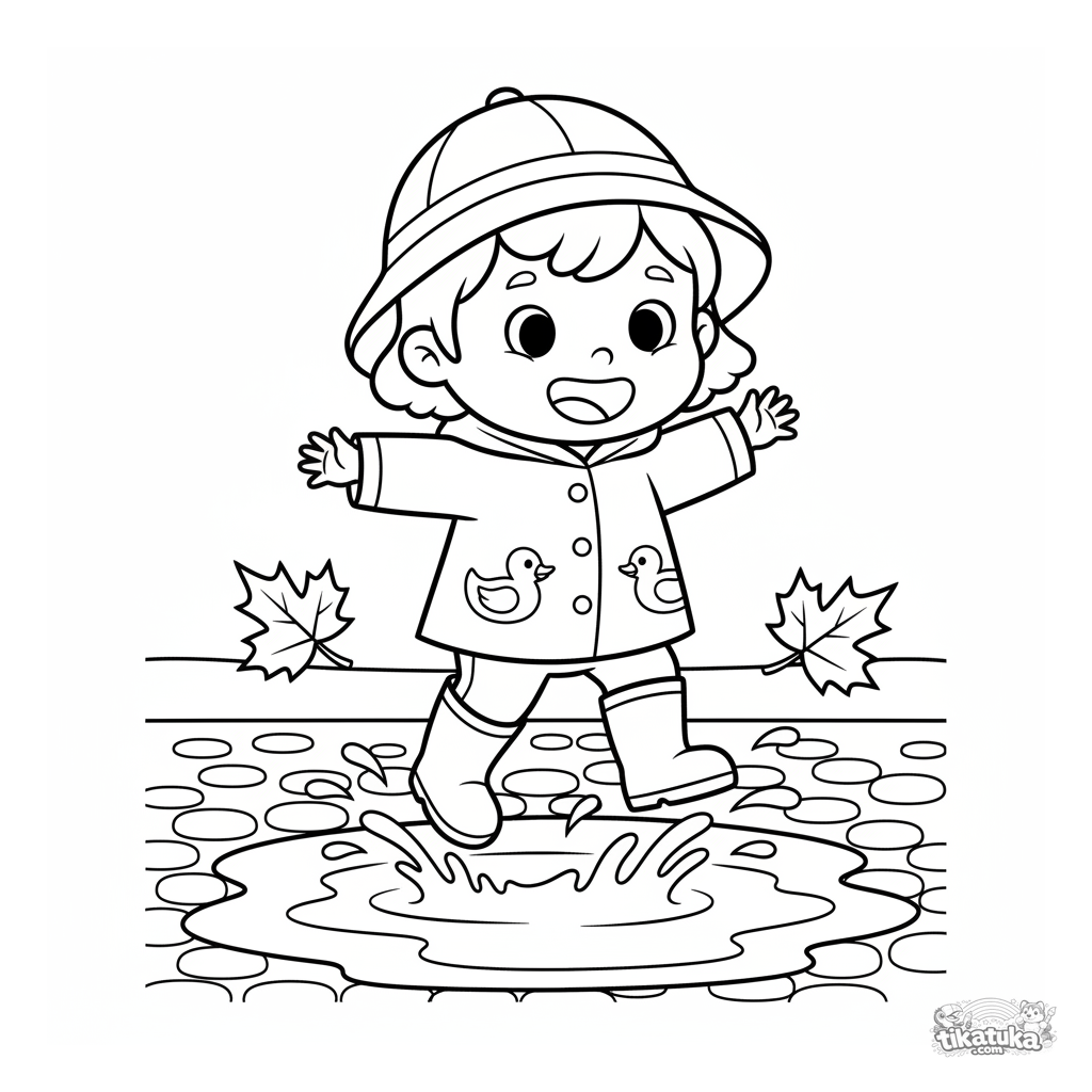Ausmalbild für Kleinkinder 2-3 Jahre: ein fröhliches Kind in Gummistiefeln springt in eine Herbstpfütze. Einfache, große Formen mit breitem Rand.