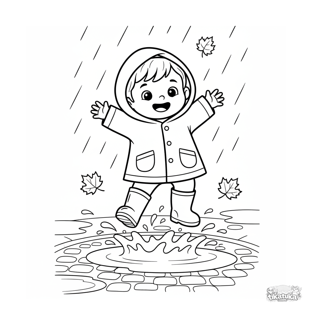 Ausmalbild für Kleinkinder 2-3 Jahre: ein fröhliches Kind in Regenmantel und Stiefeln springt in eine Herbstpfütze. Einfache Umrisse, große Flächen zum Ausmalen.