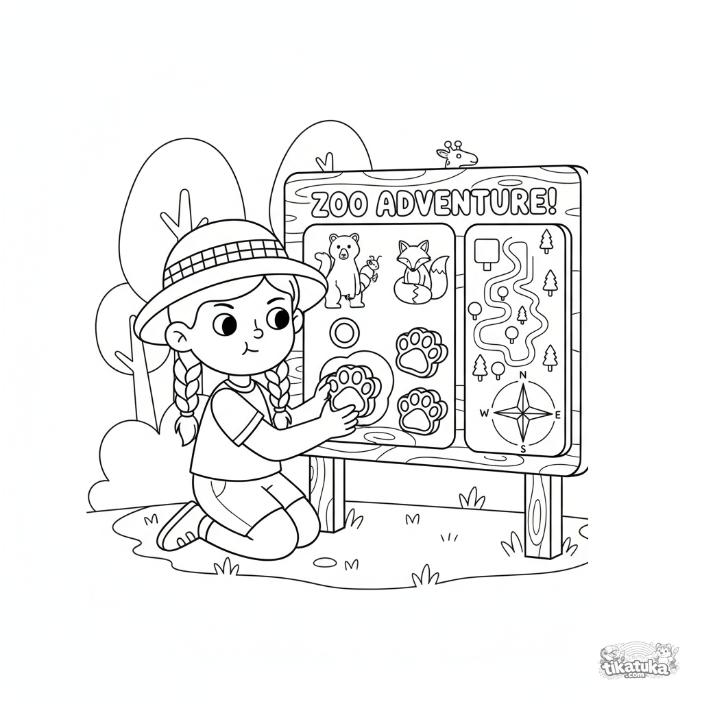 Ausmalbild für Kinder 4-6: Ein Kind ordnet Holzausschmitte von Tierspuren ihren Silhouetten auf einem großen interaktiven Wegweiser im Zoo zu. Lehrreiche Spielszene.