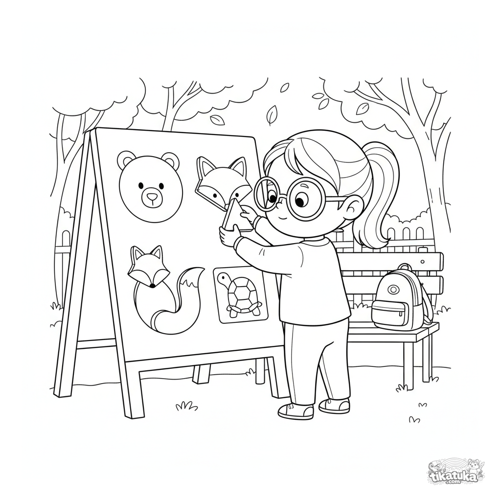Ausmalbild für Kinder 7-9: Ein Kind ordnet Formen Tier-Silhouetten an einem Lernbrett im Zoo zu. Mäßiges Detail.