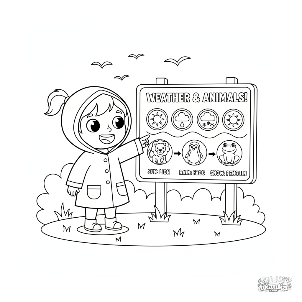 Ausmalbild für Kinder 4-6: Ein Kind lernt über Wetter und Tiere an einem Zoo-Schild. Helle Sonnen-, Regen- und Schneesymbole, einfache Formen zum Ausmalen.