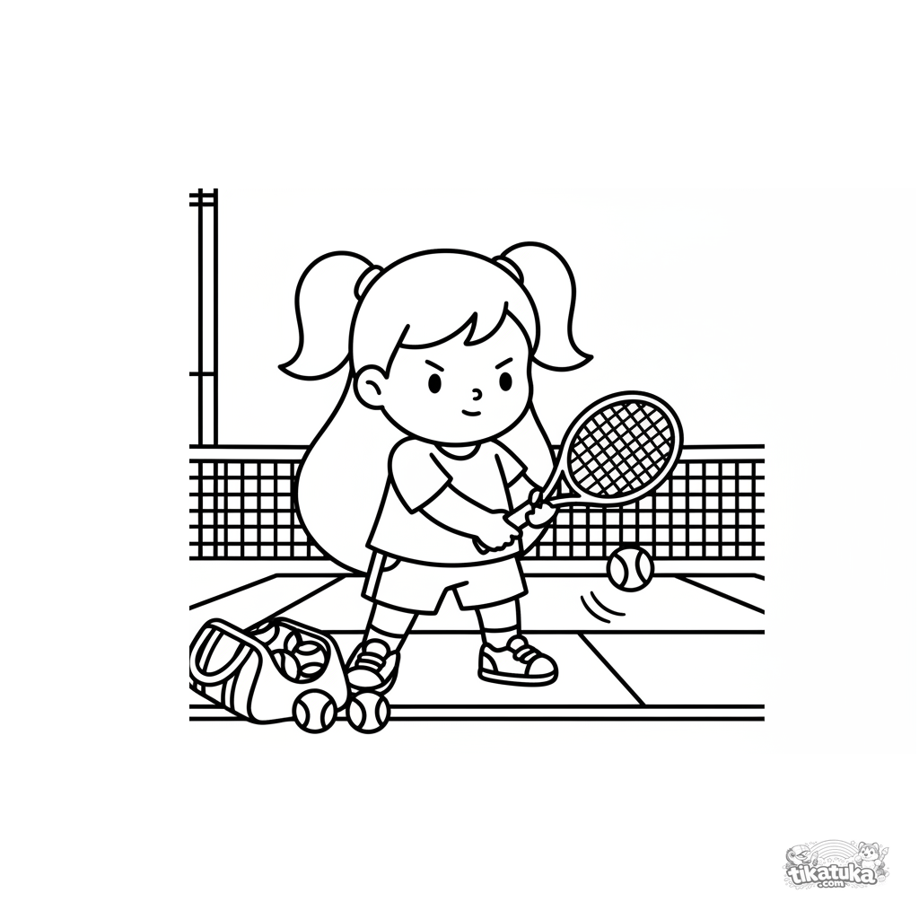 Ausmalbild für Kinder 4-6: Ein Kind übt fleißig seinen Schlag an einer Tennis-Rückwand auf dem Platz. Einfache Formen, Ball, Schläger, Tasche.