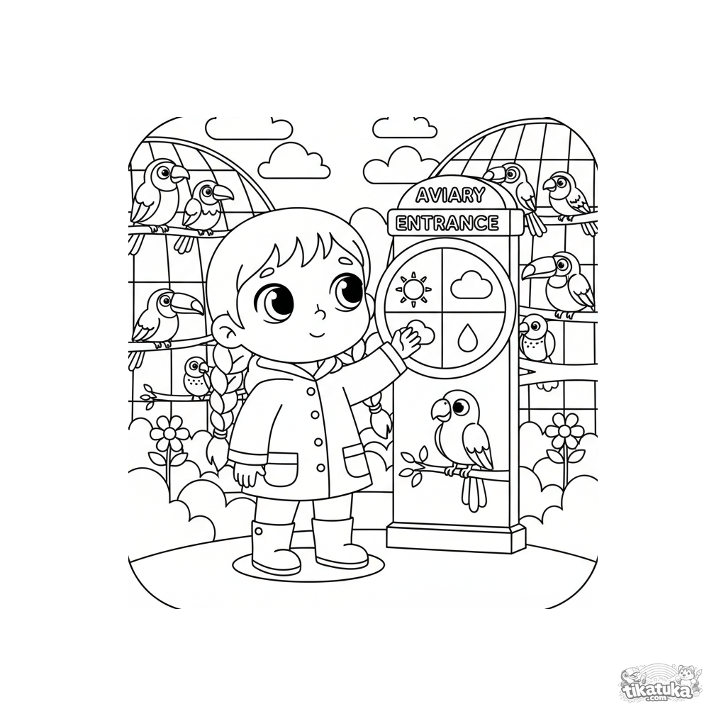 Ausmalbild für Tweens 7-9: ein Kind liest ein Wetterrad am Eingang der Voliere im Zoo. Lehrreiche Szene über Meteorologie.