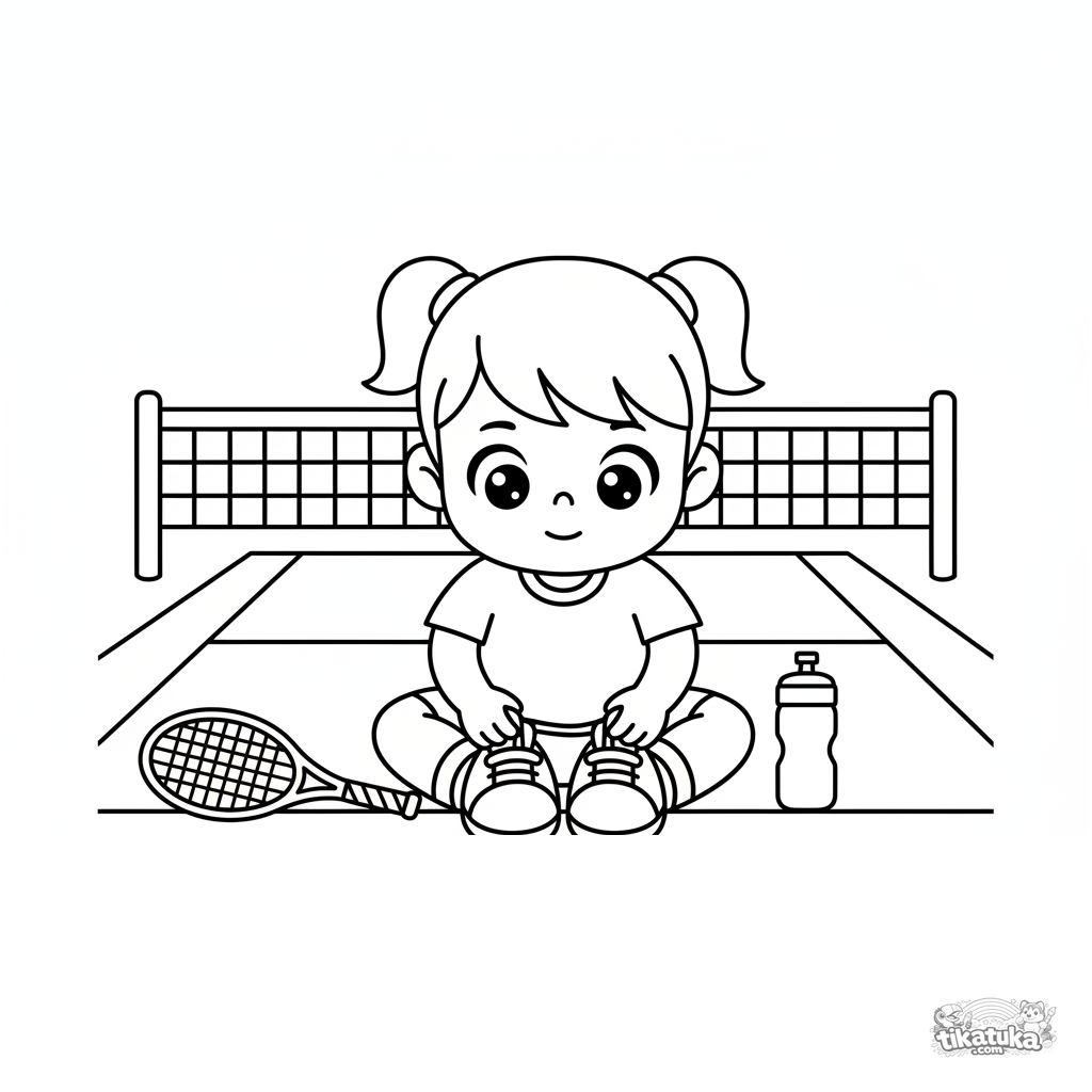 Sehr einfaches Ausmalbild für Kleinkinder 2-3 Jahre: Ein Kind sitzt auf einem Tennisplatz und bindet seine Schnürsenkel.
