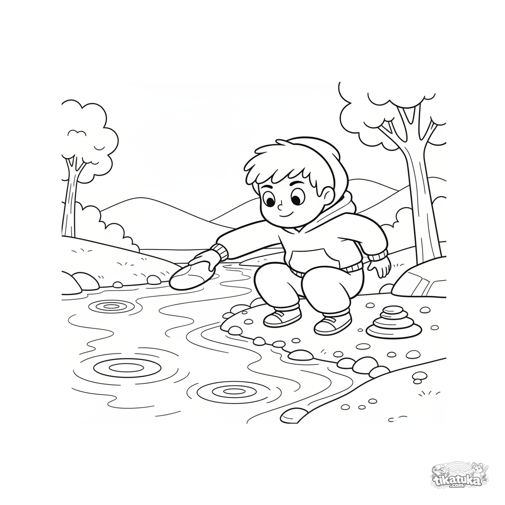 Ausmalbild für Kinder 7-9: ein Kind lässt Steine über einen Bach hüpfen. Dynamische Pose, sommerlicher Zeitvertreib im 90er-Cartoon-Stil.