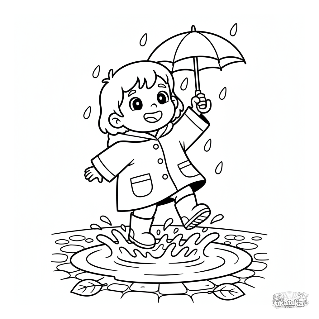 Ausmalbild für Kleinkinder 2-3 Jahre: ein fröhliches Kind in Regenjacke und Stiefeln springt in einer Herbstpfütze im Regen. Einfache, große Formen mit breiten Rändern.
