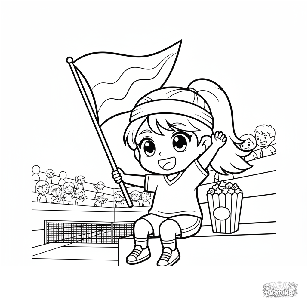 Ausmalbild für Kinder 7-9 Jahre: junger Fan winkt mit Flagge auf Tennisstadion-Tribüne. Ausdrucksstarke Emotionen, mäßiges Szenendetail.