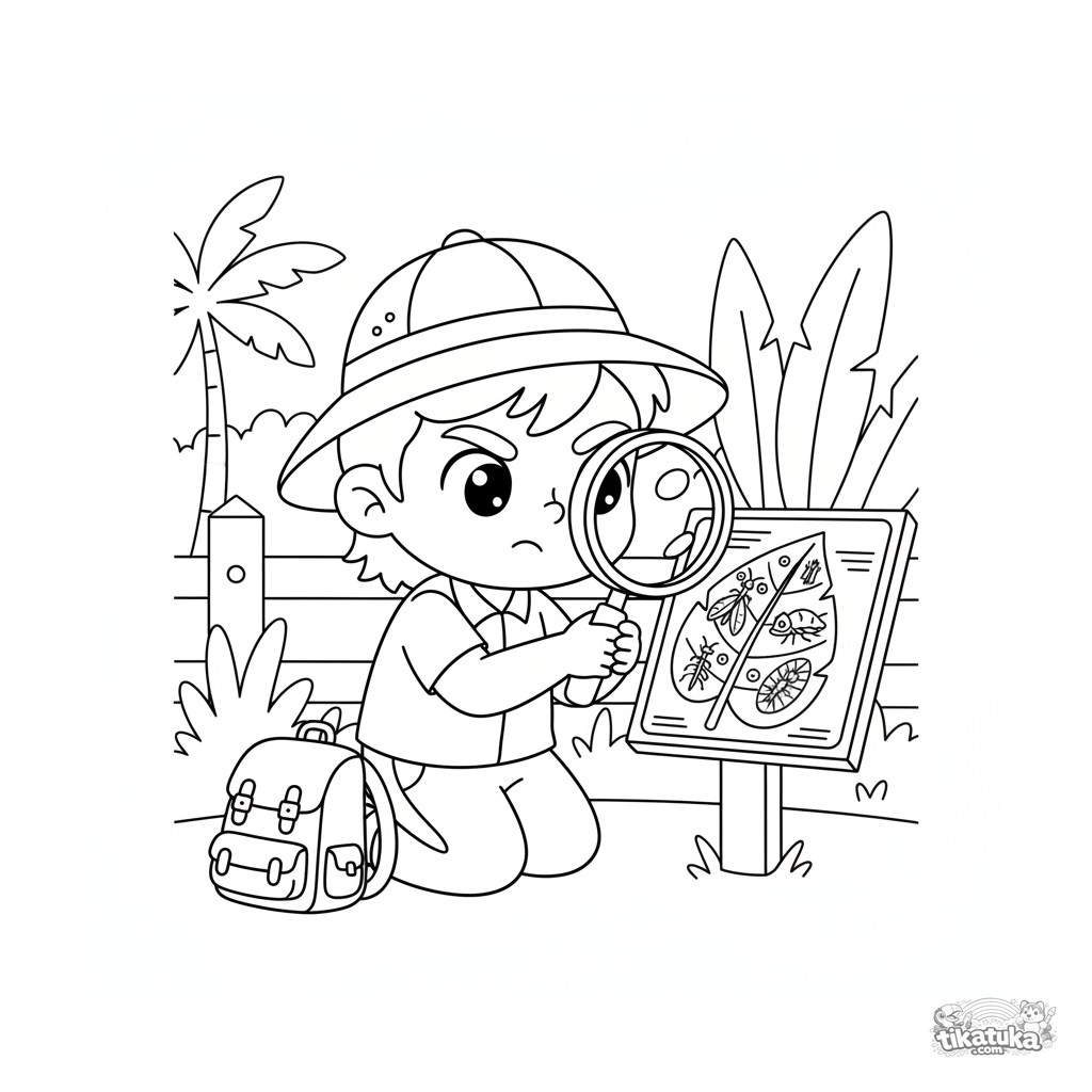 Ausmalbild für Kinder 7-9: Ein junger Forscher mit einer Lupe studiert ein Schild über Insekten-Tarnung im Zoo. Eine Szene der Entdeckung und des Lernens.