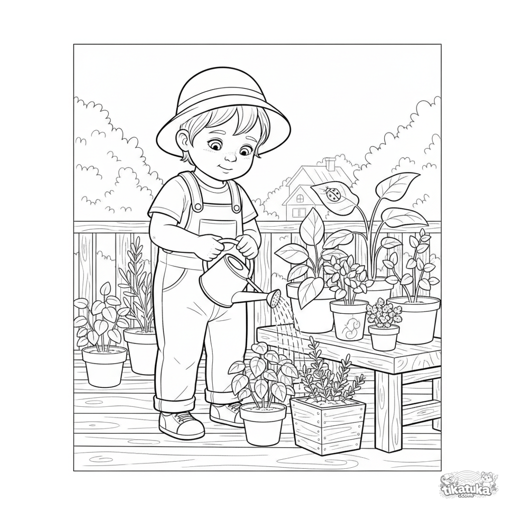 Ausmalbild für Kinder 7-9: Ein Kind in Gartenhose gießt Topfpflanzen auf einer Datscha-Veranda. Eine detaillierte und süße Sommerszene.